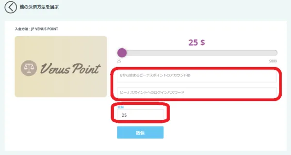 入金する金額を入力したら「送信」を押します。Payzのログインページに切り替わります。