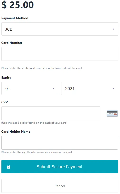 カード番号・有効期限・セキュリティコード(CVV)・カード名義を入力し、「Submit Secure Payment」を押せば入金完了です。