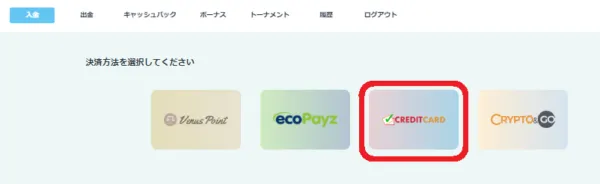 入金画面が表示されたら、「CREDITCARD」を選択します。