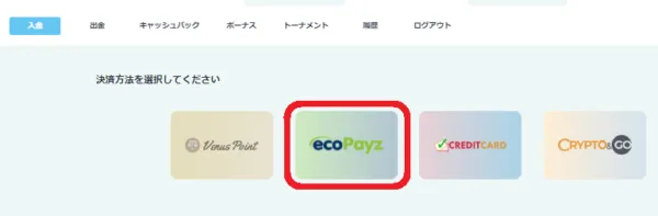 ログイン後、「入金」を押して入金画面を開き、「Payz」を選択します。
